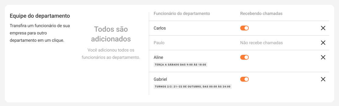 During the employee’s off-hours, a gray badge Is not receiving calls will appear next to their name on the Employees tab.