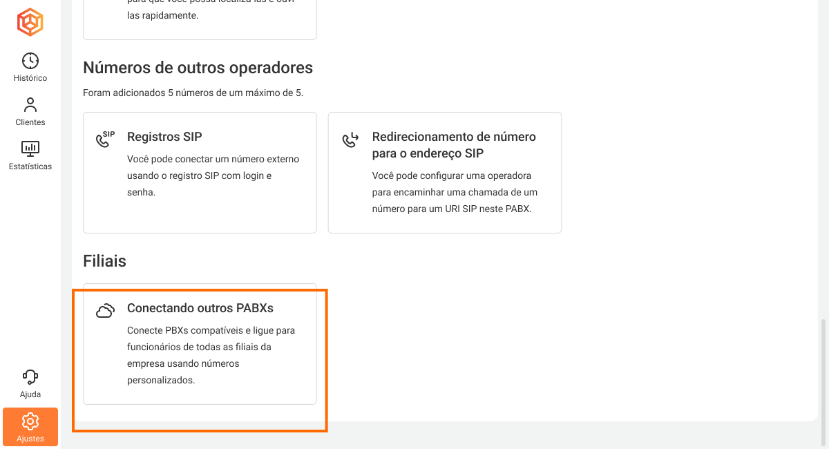 1. Vá até a seção Mais nas configurações do seu PABX móvel. Na parte inferior da página, encontre a seção Conectar Outros PABXs.