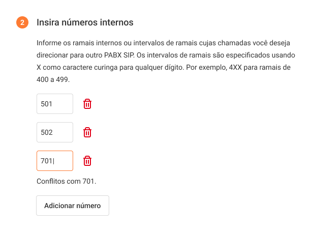 4. Especifique os ramais do PABX conectado ou seus intervalos para que o PABX móvel saiba quais chamadas devem ser encaminhadas para o PABX conectado. É possível adicionar quantos números e intervalos forem necessários.