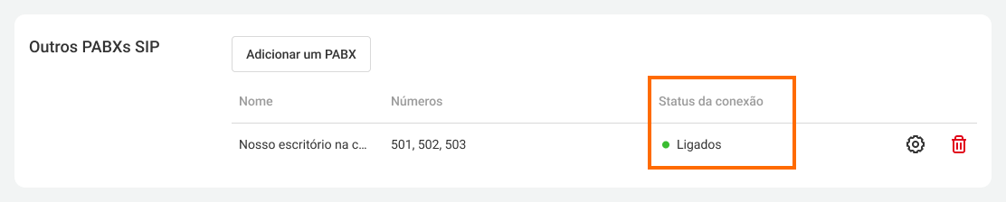 Após configurar, o status da conexão do PABX SIP na conta do PABX móvel mudará para Conectado e será indicado com um marcador verde. Isso significa que agora você tem acesso a chamadas entre usuários do PABX móvel e do PABX SIP conectado usando ramais.