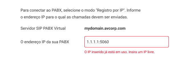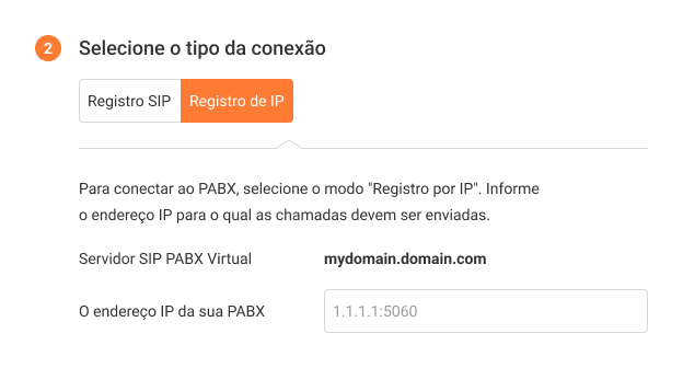 Se você quiser conectar um PABX SIP usando trunk SIP (SIP trunking), selecione o tipo de conexão Registro por IP e especifique o endereço IP do PABX que você está conectando, no formato 1.1.1.1:5060.