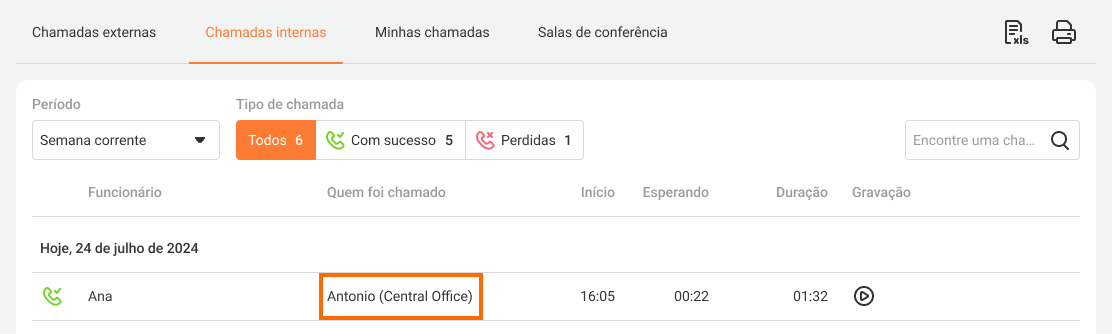 Agora você pode fazer e transferir chamadas utilizando os números curtos (ramais) entre os sistemas PABX móvel. Tais chamadas aparecerão em Histórico na aba Chamadas internas e poderão ser ouvidas. Na coluna Chamou quem, o nome da filial à qual o gerente pertence será exibido entre parênteses.