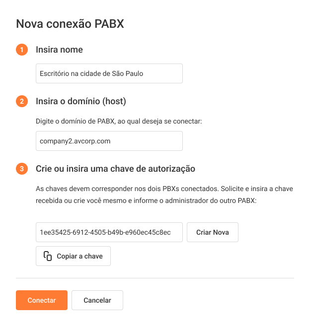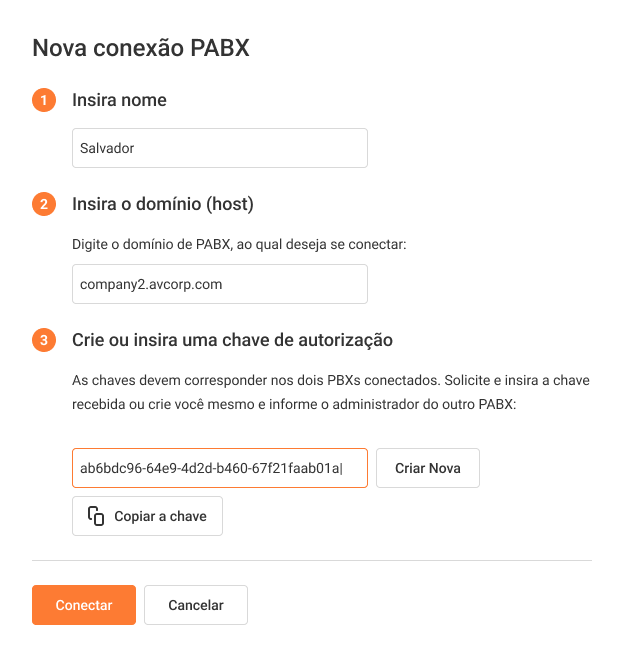 4. Vá até o PABX móvel que você deseja adicionar. Adicione os dados do seu primeiro PABX móvel da mesma forma. Insira a chave de autorização que você criou anteriormente para o primeiro PABX.