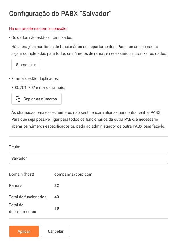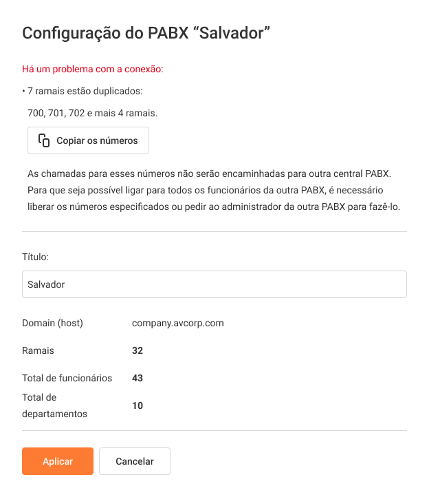 Se ambos os PABXs foram inicialmente criados de forma independente, existe a possibilidade de sobreposição de números internos. Isso não impedirá a conexão dos PABXs, mas funcionários com números sobrepostos não serão acessíveis a partir do outro PABX. Durante o processo de conexão, aparecerá a seguinte mensagem de aviso: