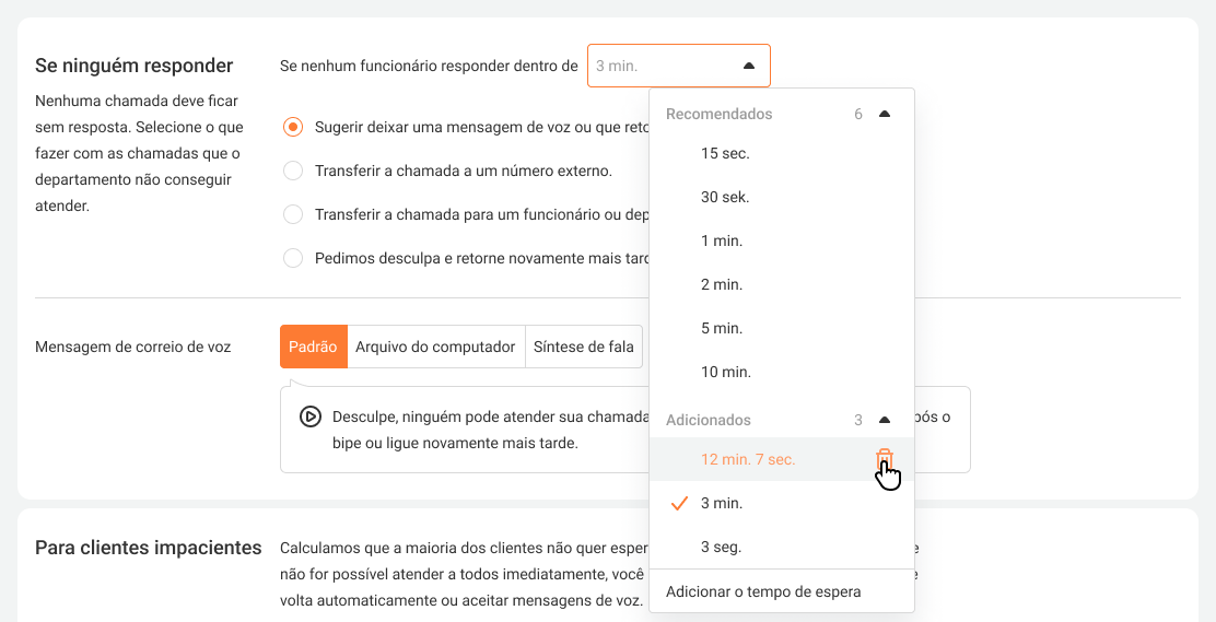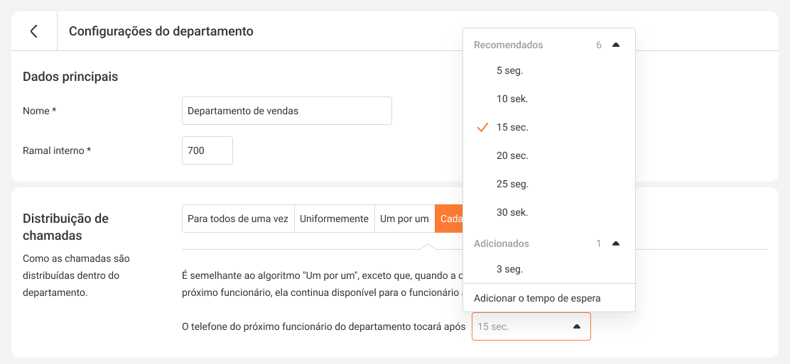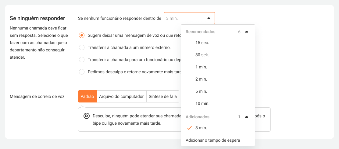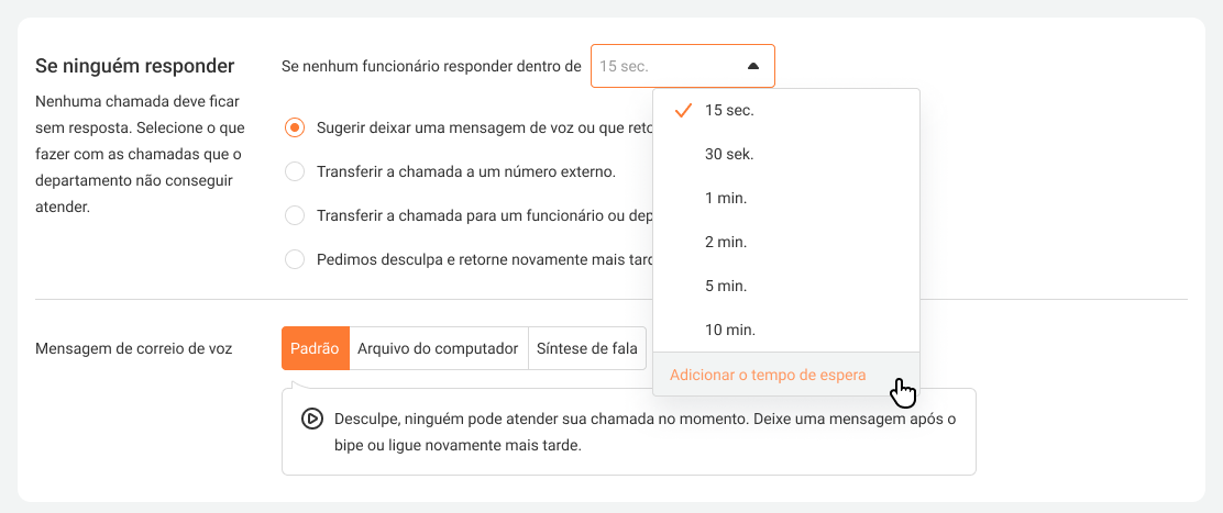 Para evitar perder chamadas de clientes, configure o tempo de espera para resposta de um funcionário levando em conta as especificidades da operação da sua empresa. Vamos ver o exemplo das configurações de um departamento na seção Se ninguém atender: